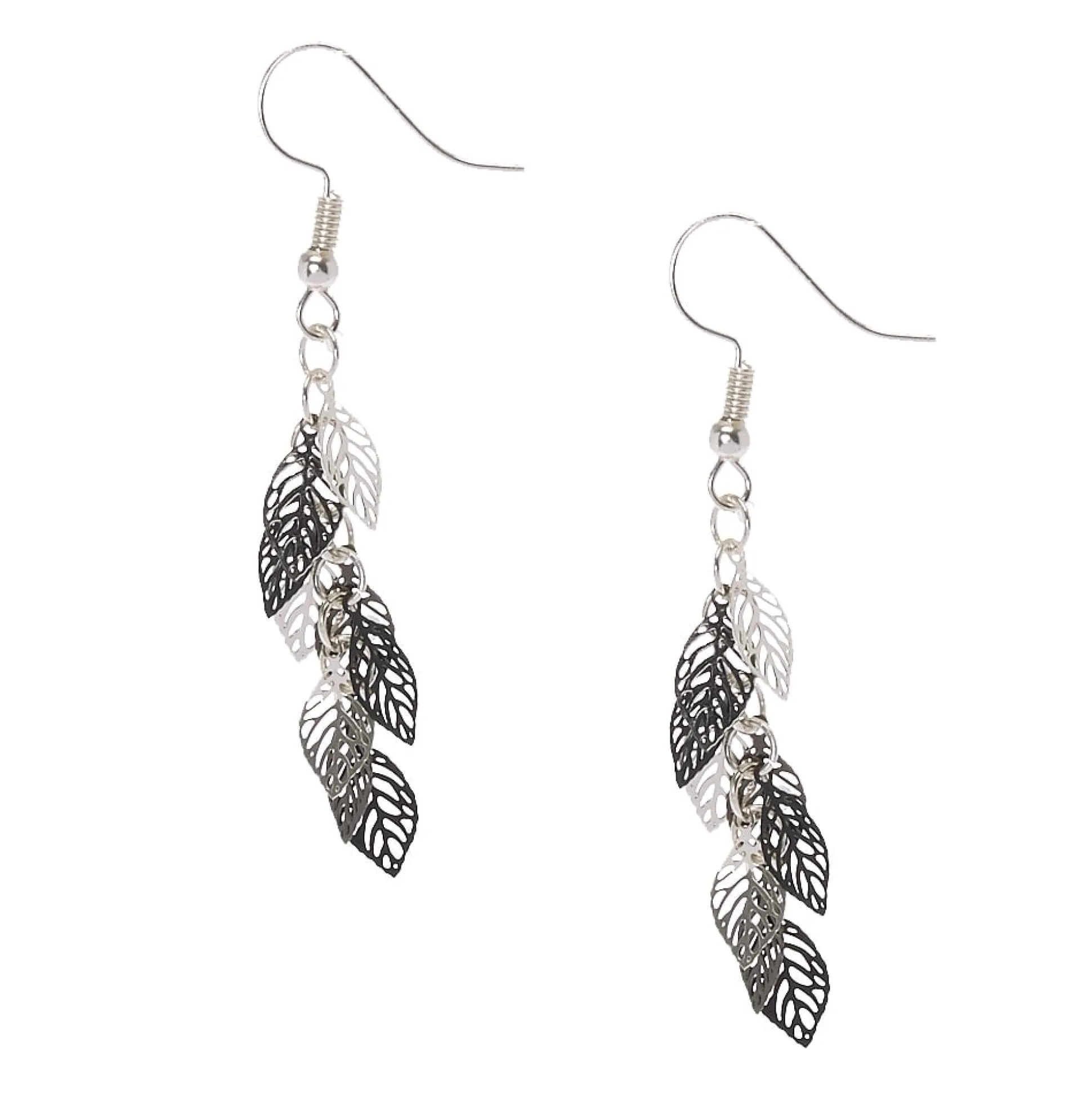 Donne à tes oreilles un style naturel avec cette paire de pendants d’oreilles. De petites feuilles noires et couleur argentés découpées pendent d’une chaîne couleur argenté.