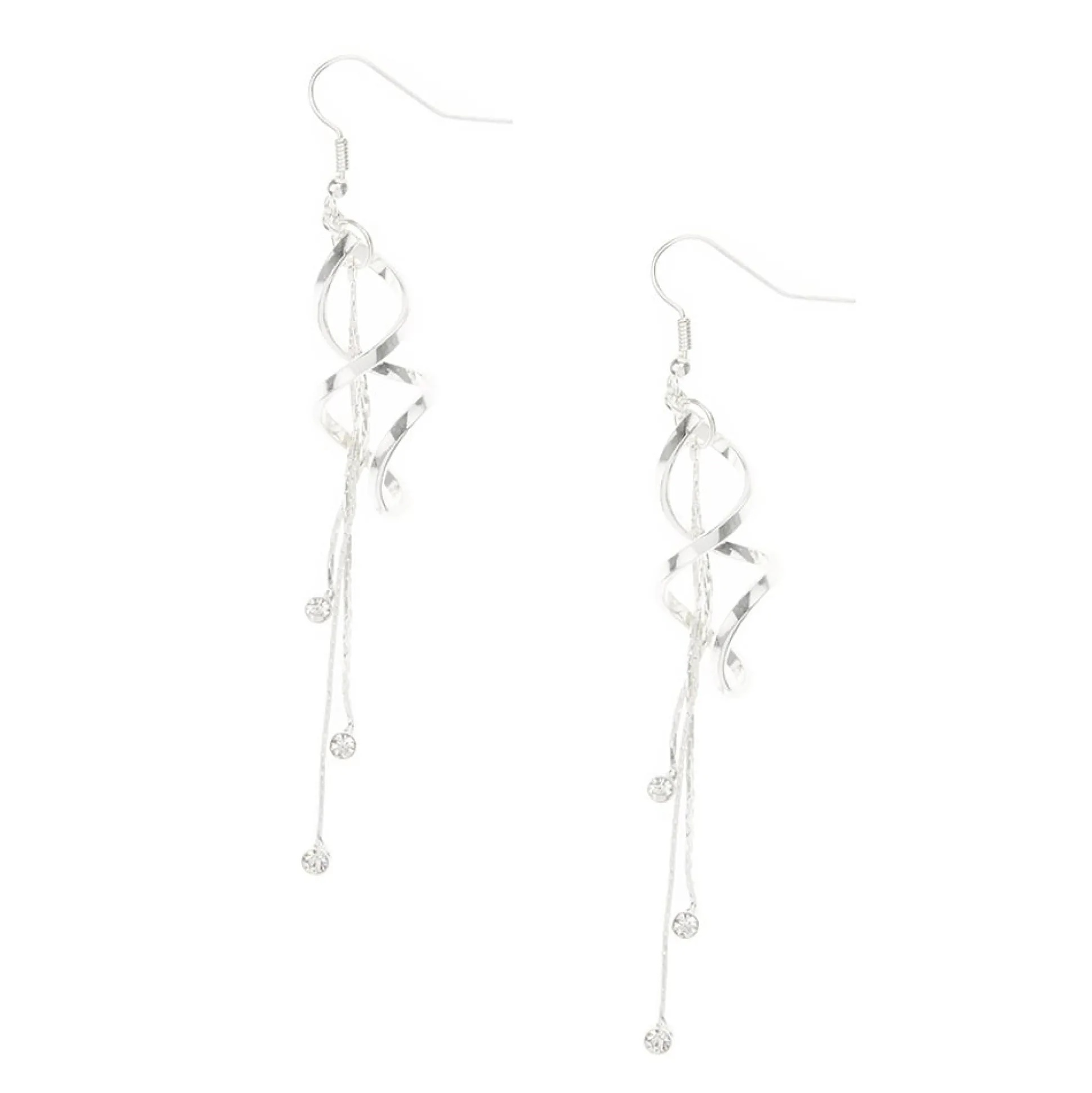 Cette paire de boucles d’oreilles est parfaite pour compléter une tenue d’occasion. Elle a été conçue avec un joli effet torsadé et de belles pierres en strass pendants. Les boucles d’oreilles ont un rendu couleur argenté et des crochets d’attache arrière.