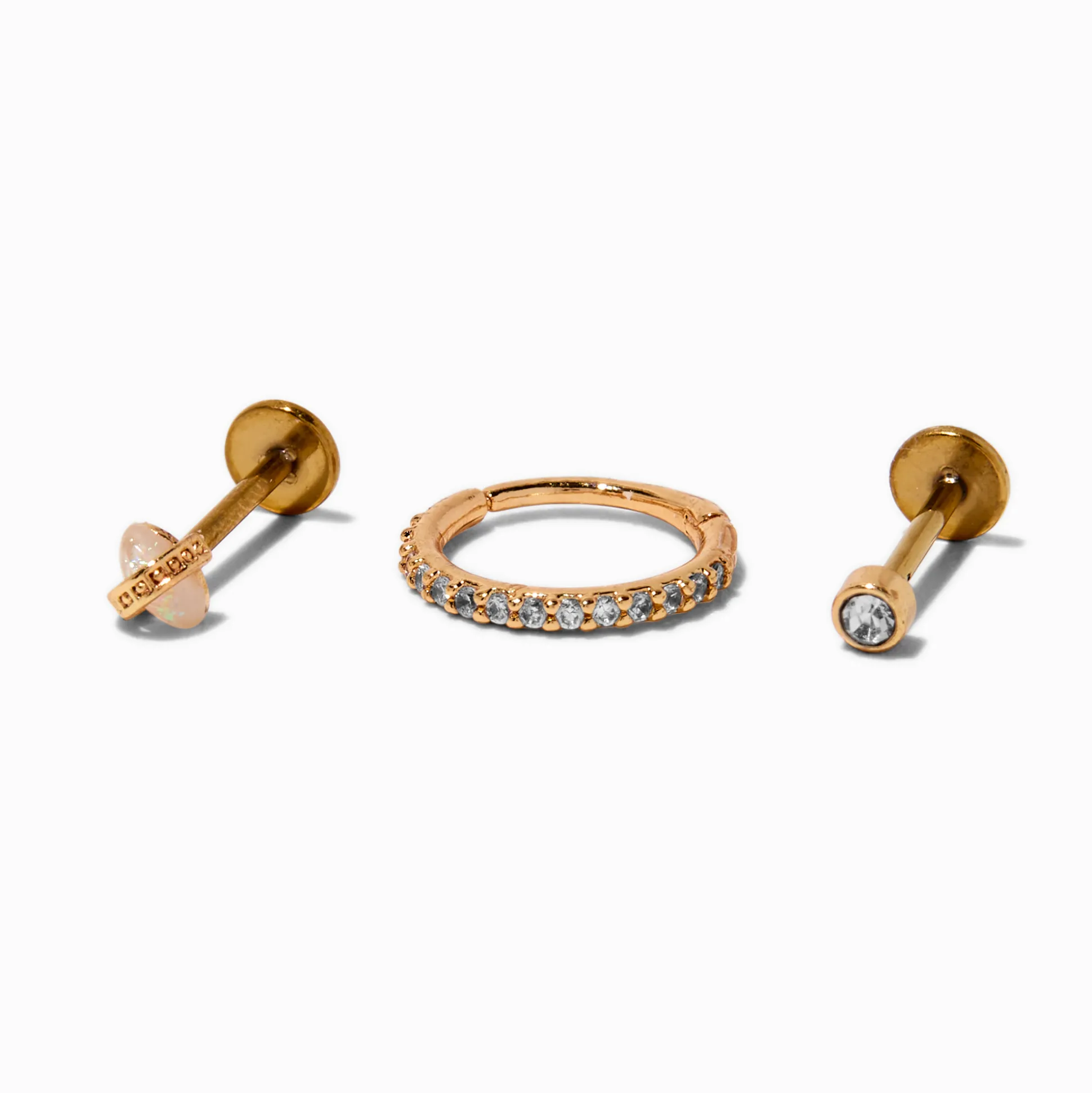 Aie toujours le piercing de cartilage parfait grâce à ce lot de trois piercings. Les options comprennent des clous à arrière plat avec zircons cubiques ovale et en serti clos, et un anneau avec des zircons cubiques incrustés. Avec une fermeture non filetée, ce clou a un avant et un arrière plat qui s’emboîtent, donc pas besoin de le tourner ou de le faire pivoter comme avec un fermoir traditionnel.
