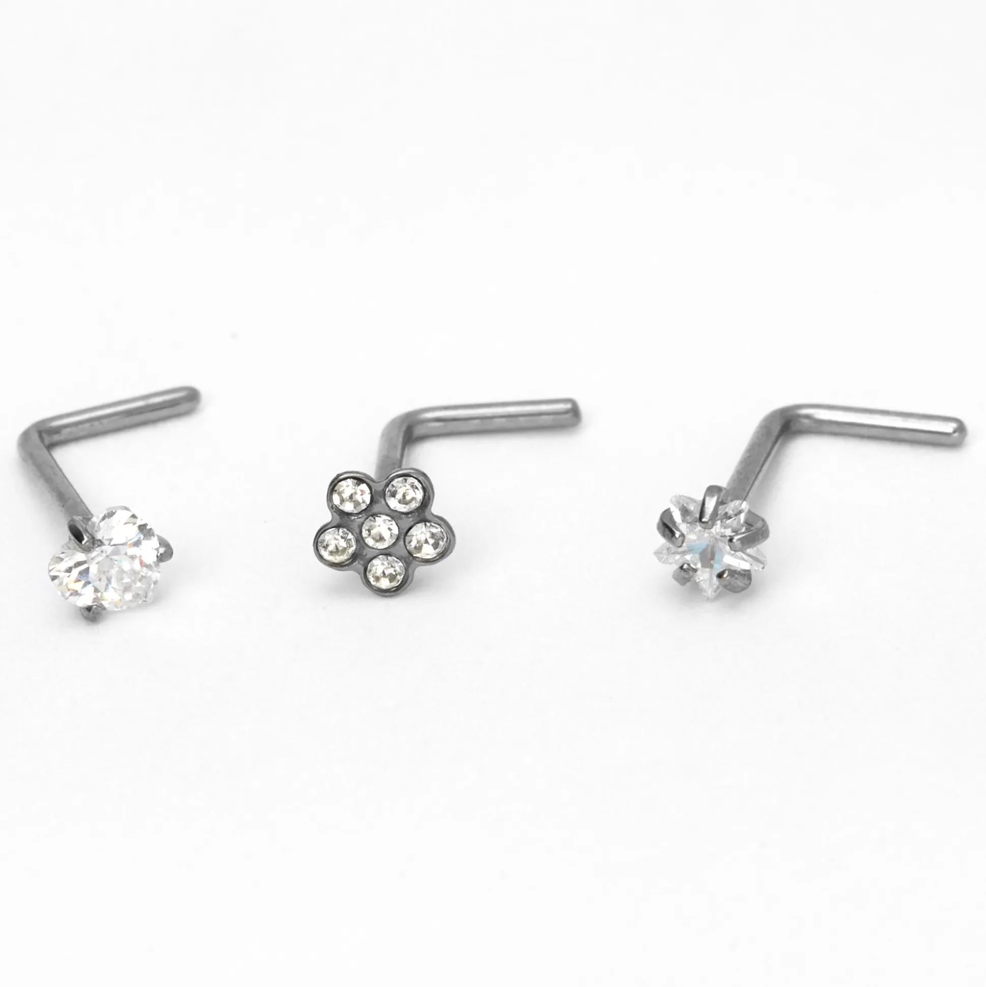Ajoute une touche girly à ton piercing de nez avec ce lot ! Le lot couleur titanée comprend 3 piercings de nez, avec des designs cœur, fleur et étoile.