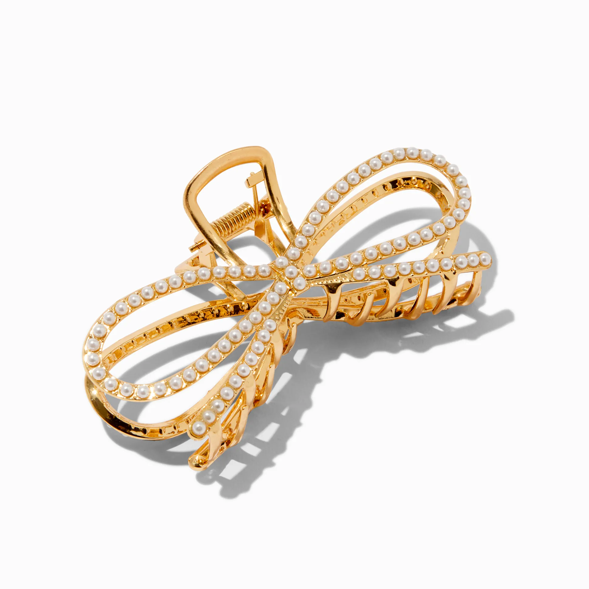Décore tes cheveux de façon coquette avec cette pince à cheveux couleur dorée. La forme de nœud est parsemée de perles d’imitation.