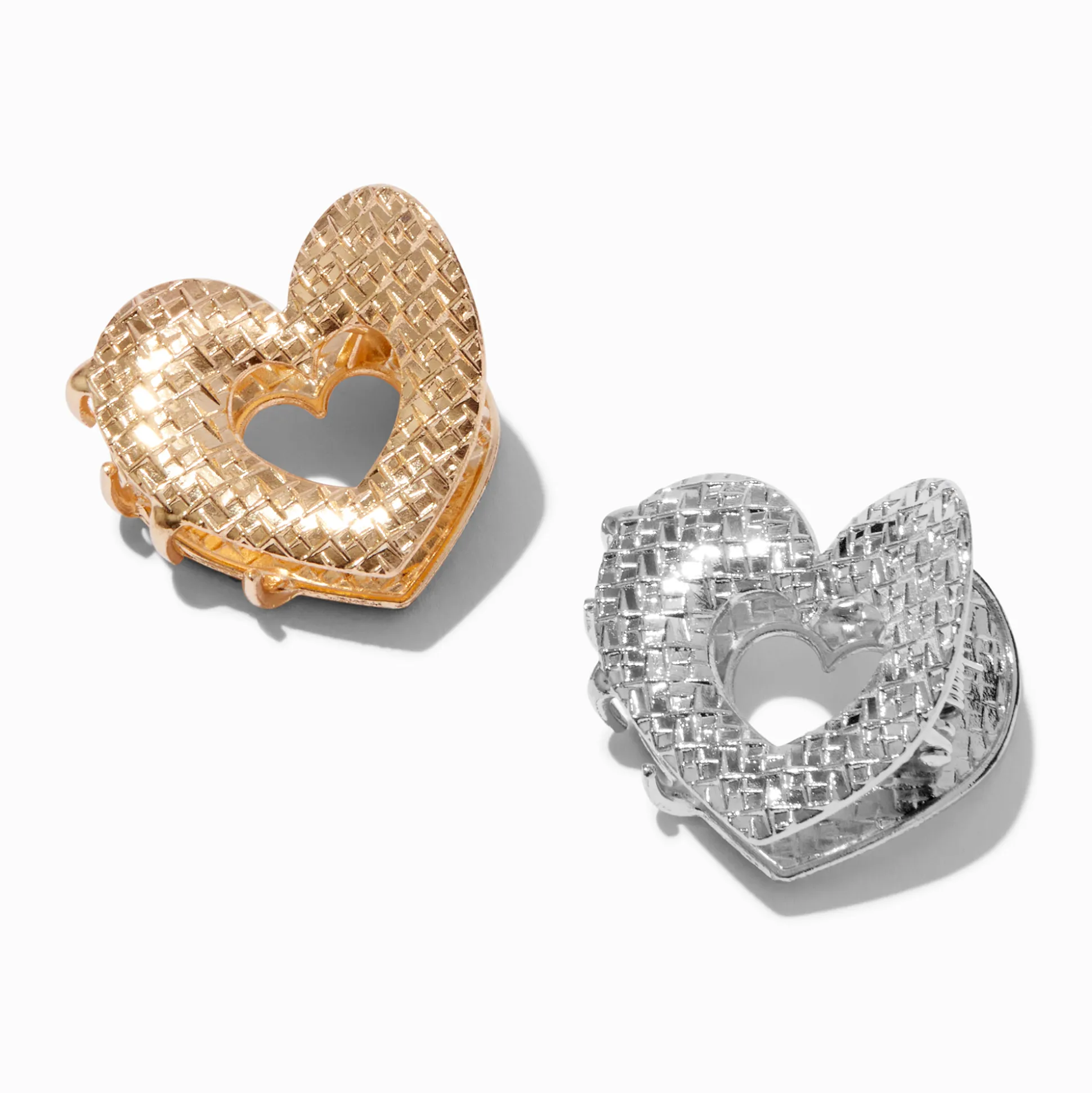 Complète ton look de manière joyeuse avec les cœurs de ces pinces à cheveux. Ce lot de pinces métalliques comprend un modèle couleur dorée et un modèle couleur argentée avec des cœurs texturés.