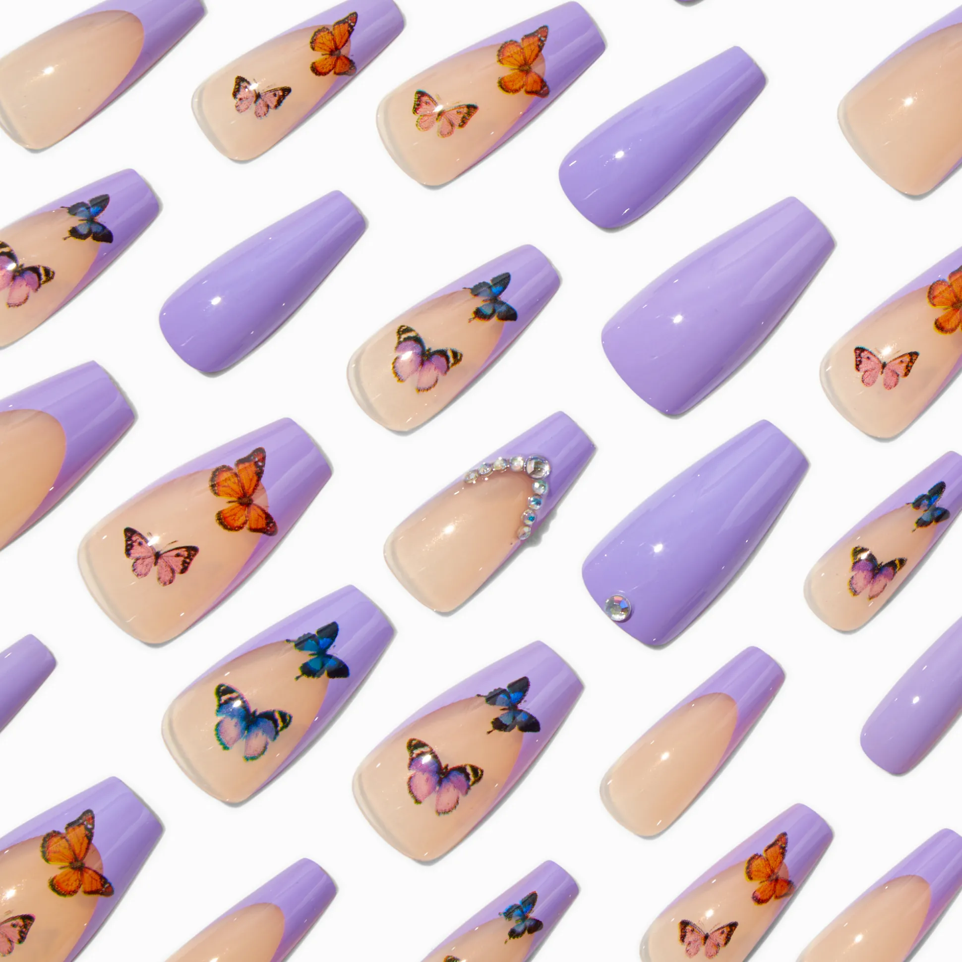 With an improved fit and up to a 7-day wear, these vegan faux nails are on-trend faves. They come in 12 different sizes, so finding the perfect shaped nail is a breeze. With a squareletto shape, these faux nails have a butterfly design.