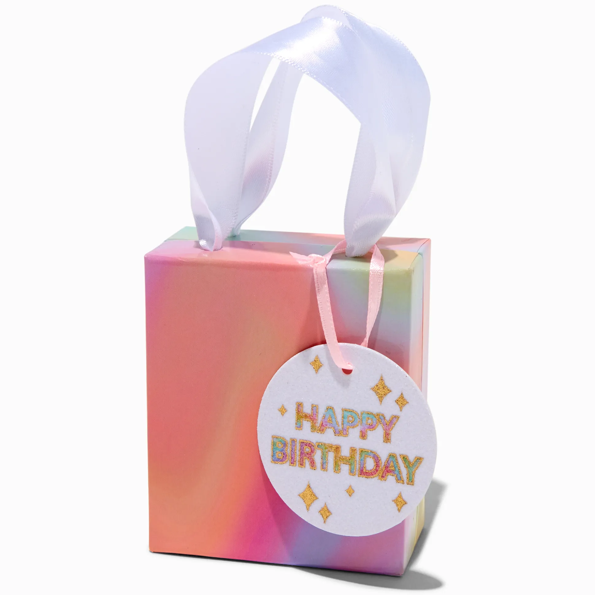 Your gift of earrings or other tiny treasures will be even more appreciated by the birthday queen when presented inside this lovely gift box! It features a rainbow swirl design and little ribbon handles