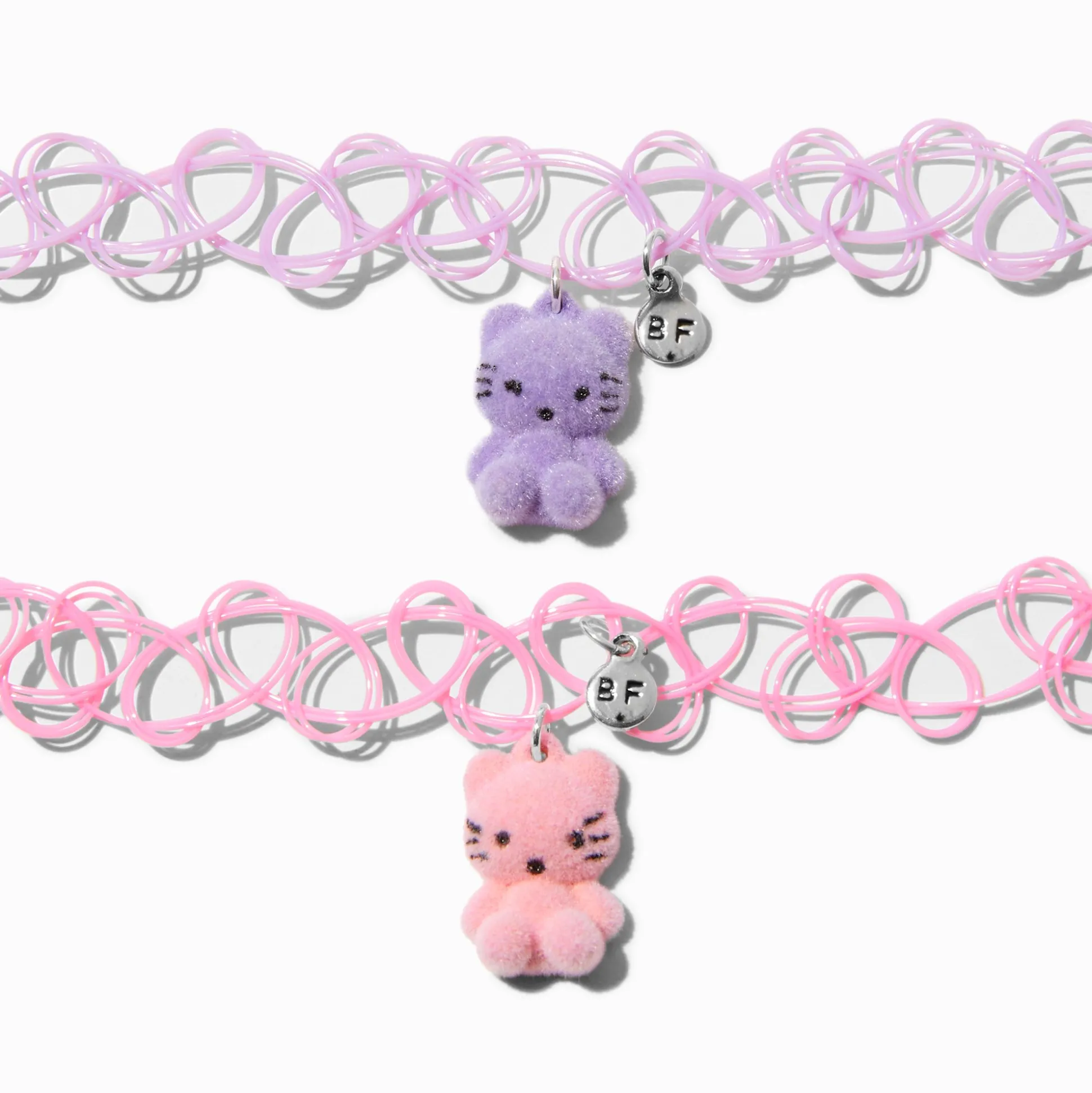 Un pour toi, et un pour ta bestie ! Ce lot de deux ras-de-cou élastiques comprend un collier violet avec un chat pelucheux violet et un collier rose avec un chat pelucheux rose, et chacun arbore une breloque « BF » délicate. Tu vas adorer les assortir !