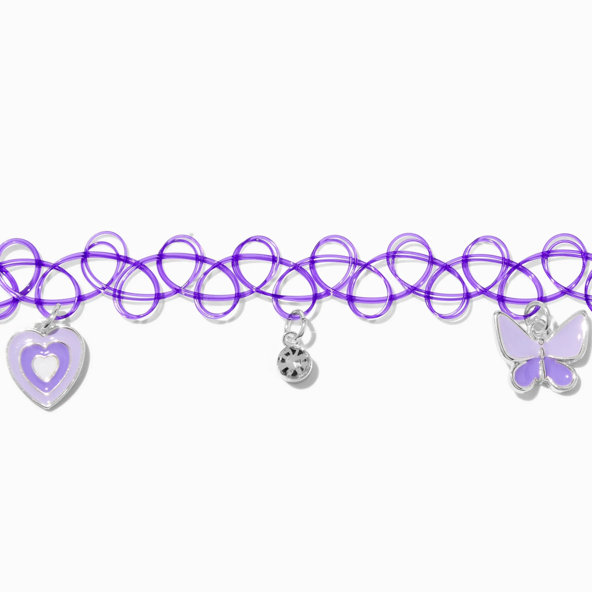 Sois toi et sois au top avec ce ras-de-cou effet tatouage. Le collier violet arbore un cœur battant, un strass, et une breloque papillon.