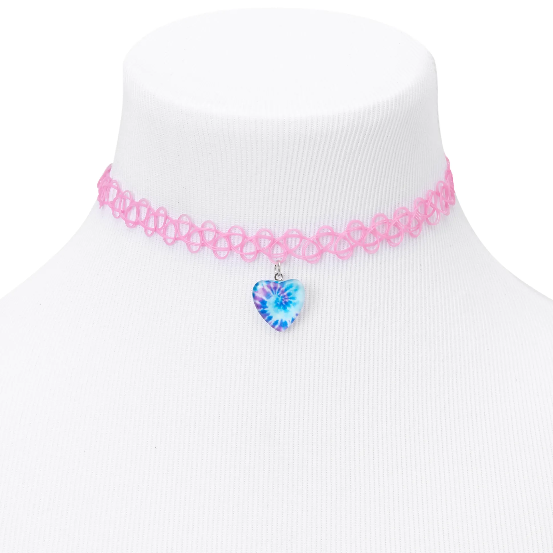 Excellentissime ! Ce pendentif en forme de cœur, entièrement revêtu de couleurs tie-dye rétro, se balance sur un ras-de-cou rose.
