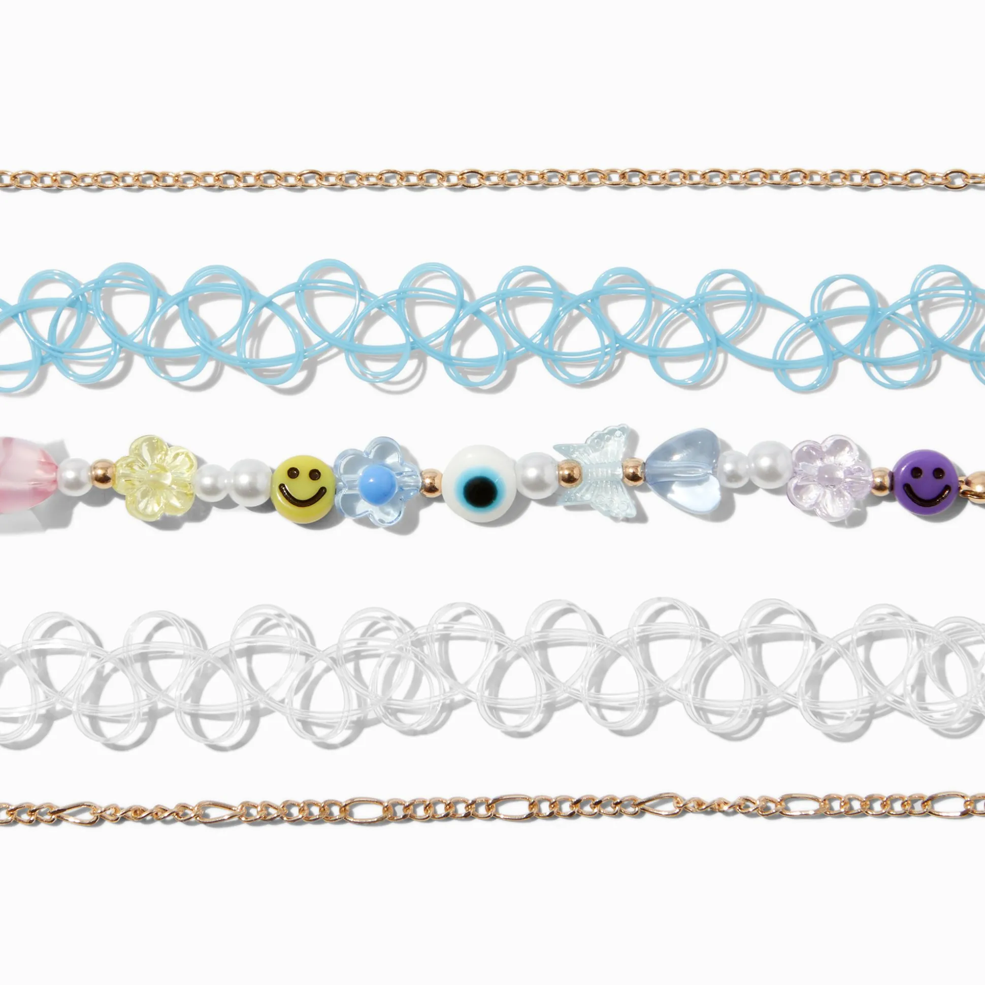 Ce lot de ras-de-cou t’offre plein d’options. Le lot de cinq ras-de-cou comprend deux ras-de-cou couleur dorée, une option perlée avec des breloques inspirées du look Y2K et deux rangs effet tatouage.