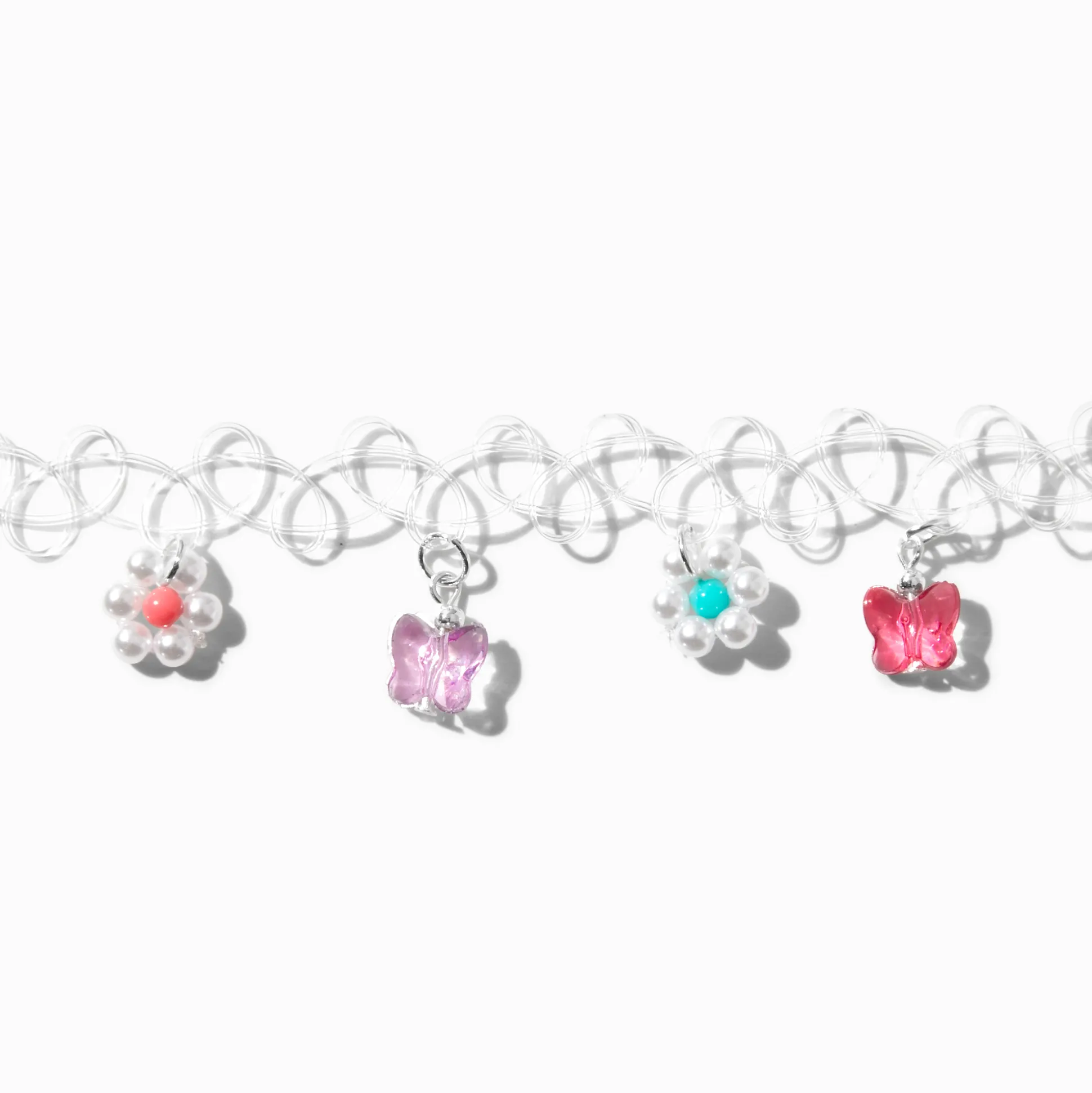 Ce ras-de-cou blanc élastique est agrémenté de papillons délicats et de jolies fleurs, ornés de perles d’imitation. C’est l’accessoire parfait par temps chaud ou pendant n’importe quelle période de l’année.