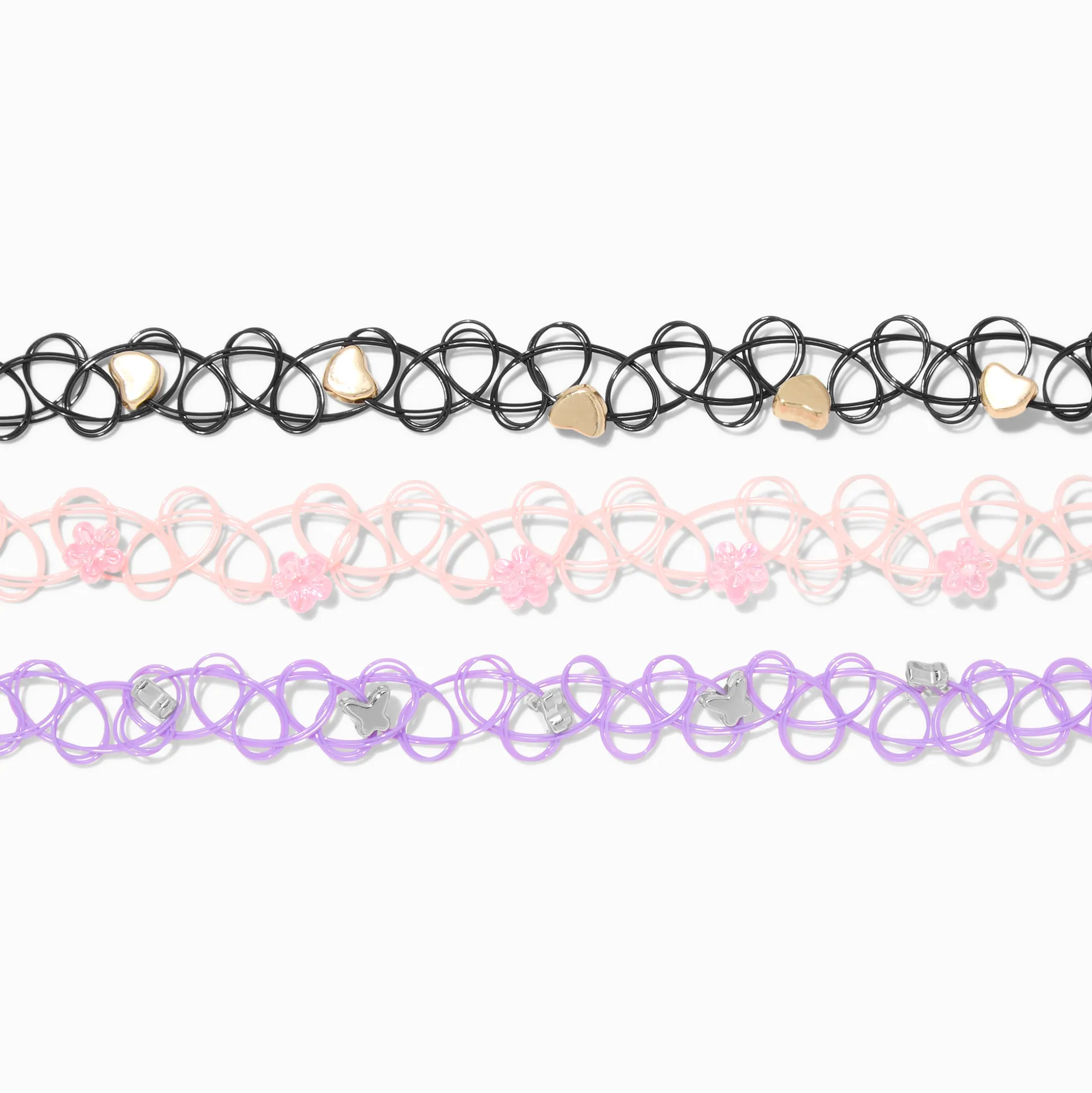 Harmonise ton humeur et ton ras-de-cou grâce à ce lot de trois colliers. Il comprend un ras-de-cou effet tatouage noir avec des cœurs couleur dorée, un ras-de-cou effet tatouage rose avec des billes fleurs roses, et un ras-de-cou effet tatouage violet avec des billes fleurs couleur argentée.