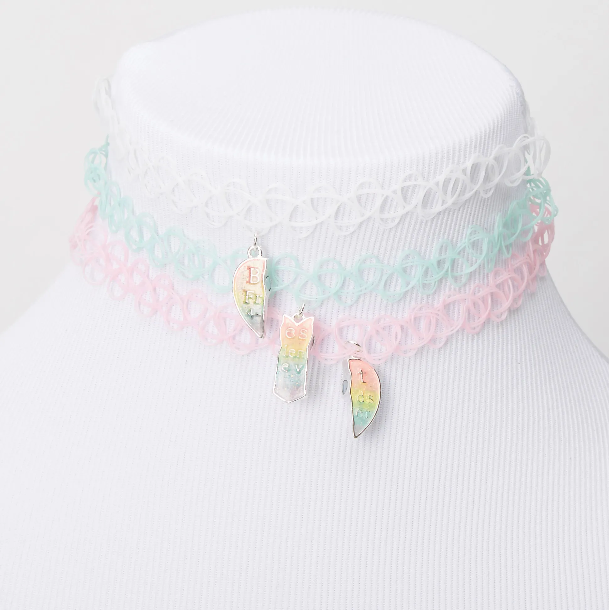 Fais plaisir à tes besties en leur offrant ces ras-de-cou assortis ! Le lot comprend des ras-de-cou effet tatouage déclinés en blanc, bleu et rose, et chacun comporte un morceau de cœur aimanté en guise de pendentif au centre du collier. Les pendentifs brillent dans le noir !