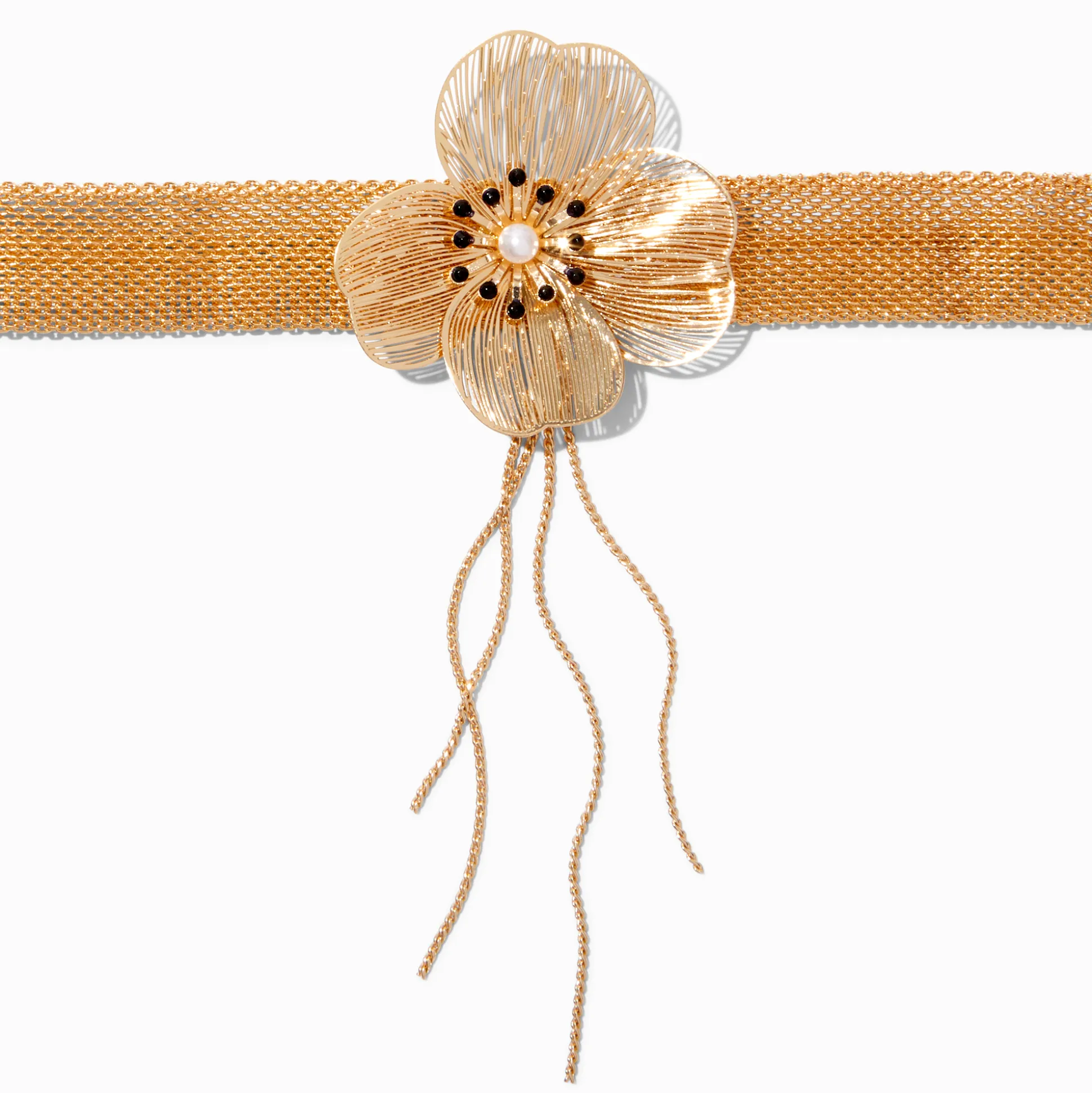 Décore ton cou avec la superbe fleur en filigrane de ce collier. Le design couleur dorée est décoré de détails filet et frange.