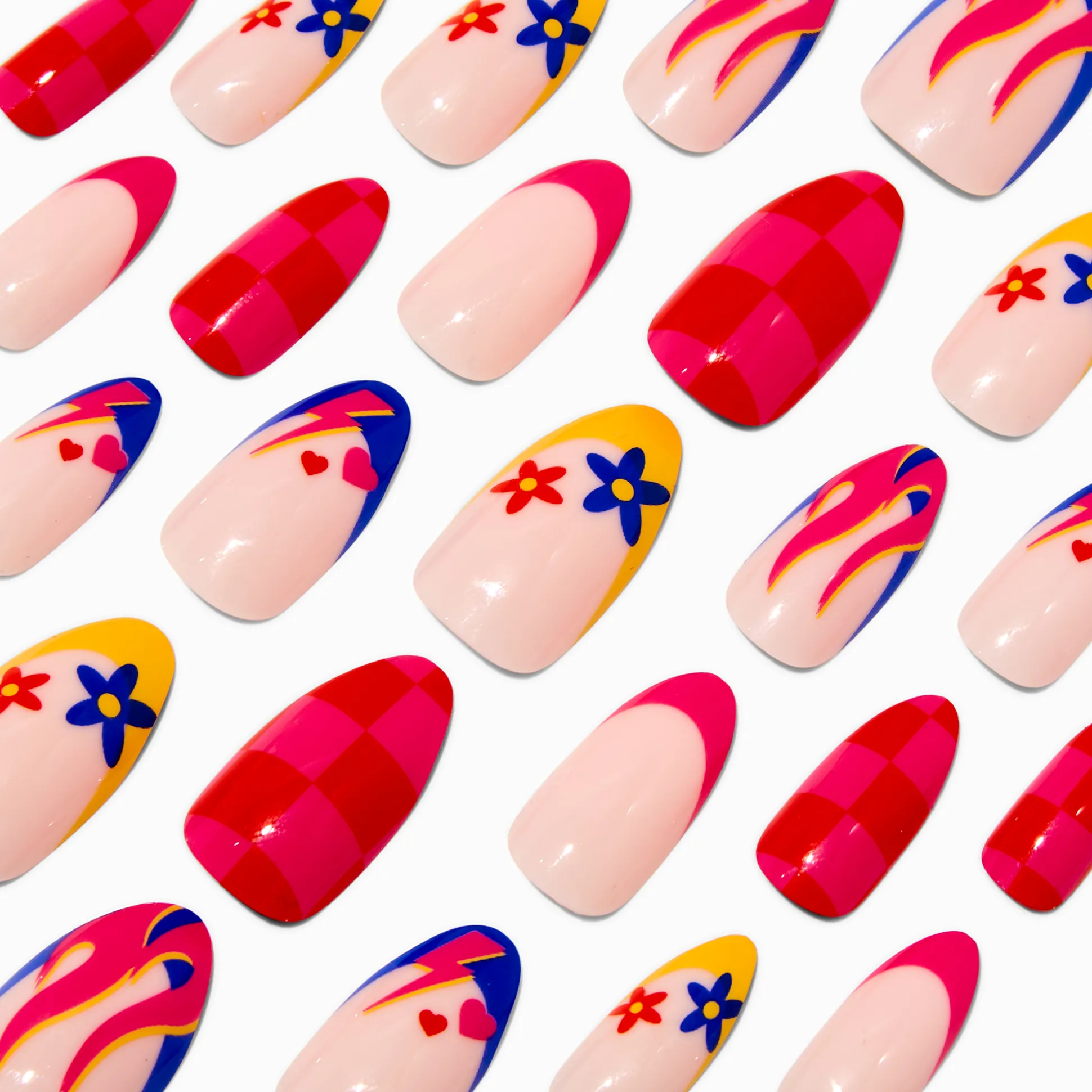 With an improved fit and up to a 7-day wear, these vegan faux nails are on-trend faves. They come in 12 different sizes, so finding the perfect shaped nail is a breeze. With a stiletto shape, these faux nails have a plethora of funky icons drawn on.
