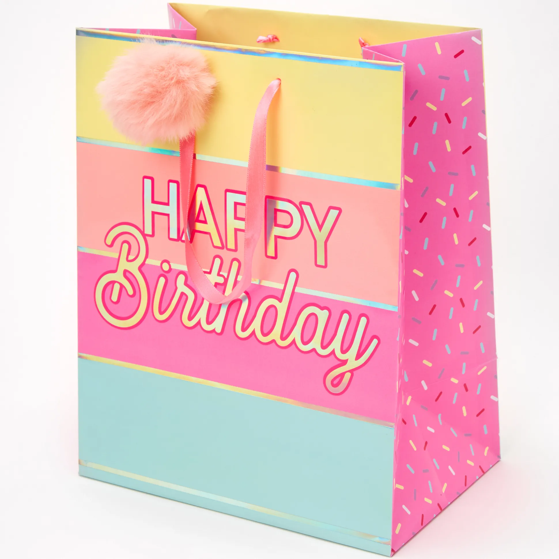 What better way to celebrate another year older than with this striped « Happy Birthday » gift bag! With pastel pink, coral, mint and yellow stripes, and confetti sides, this bag is as festive as it as fun. Equipped with a fuzzy, decorative ball in light orange, this bag is perfect -and spacious- for all those birthday goodies!