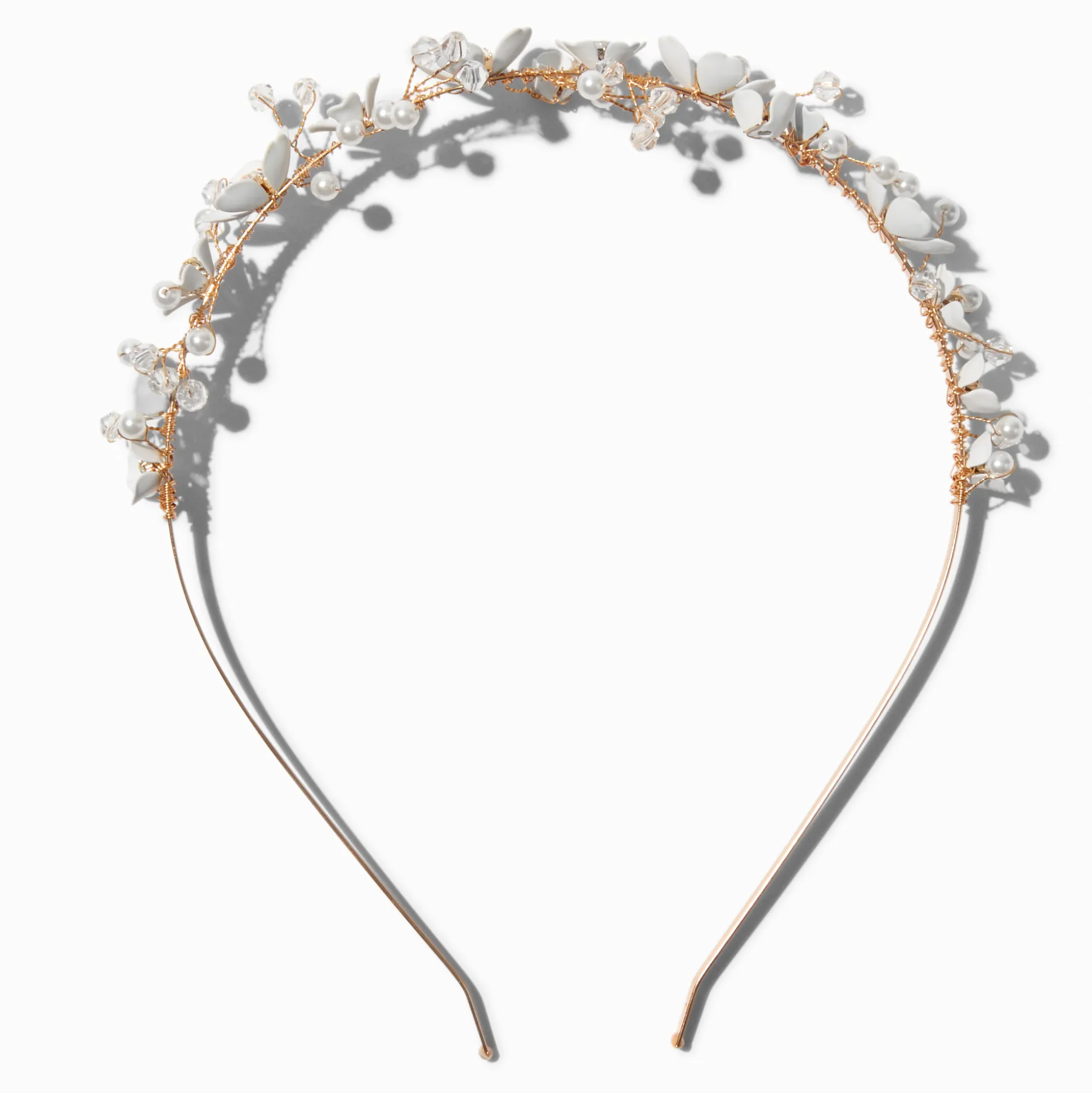 Des fleurs blanches sont attachées à un serre-tête en métal couleur dorée et l’assortiment comprend des perles d’imitation pleines de charme.