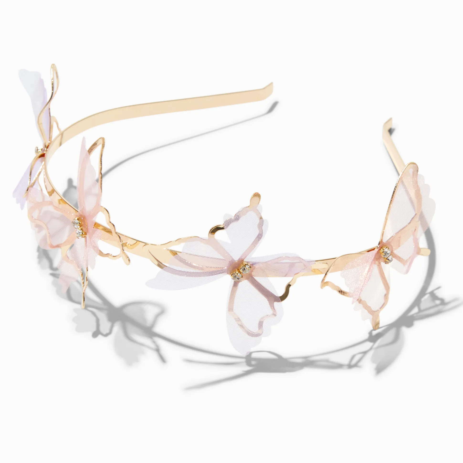 Ajoute des papillons à ta tenue préférée avec ce serre-tête couleur dorée. Le serre-tête fin arbore des papillons avec des accents en organza et en strass.