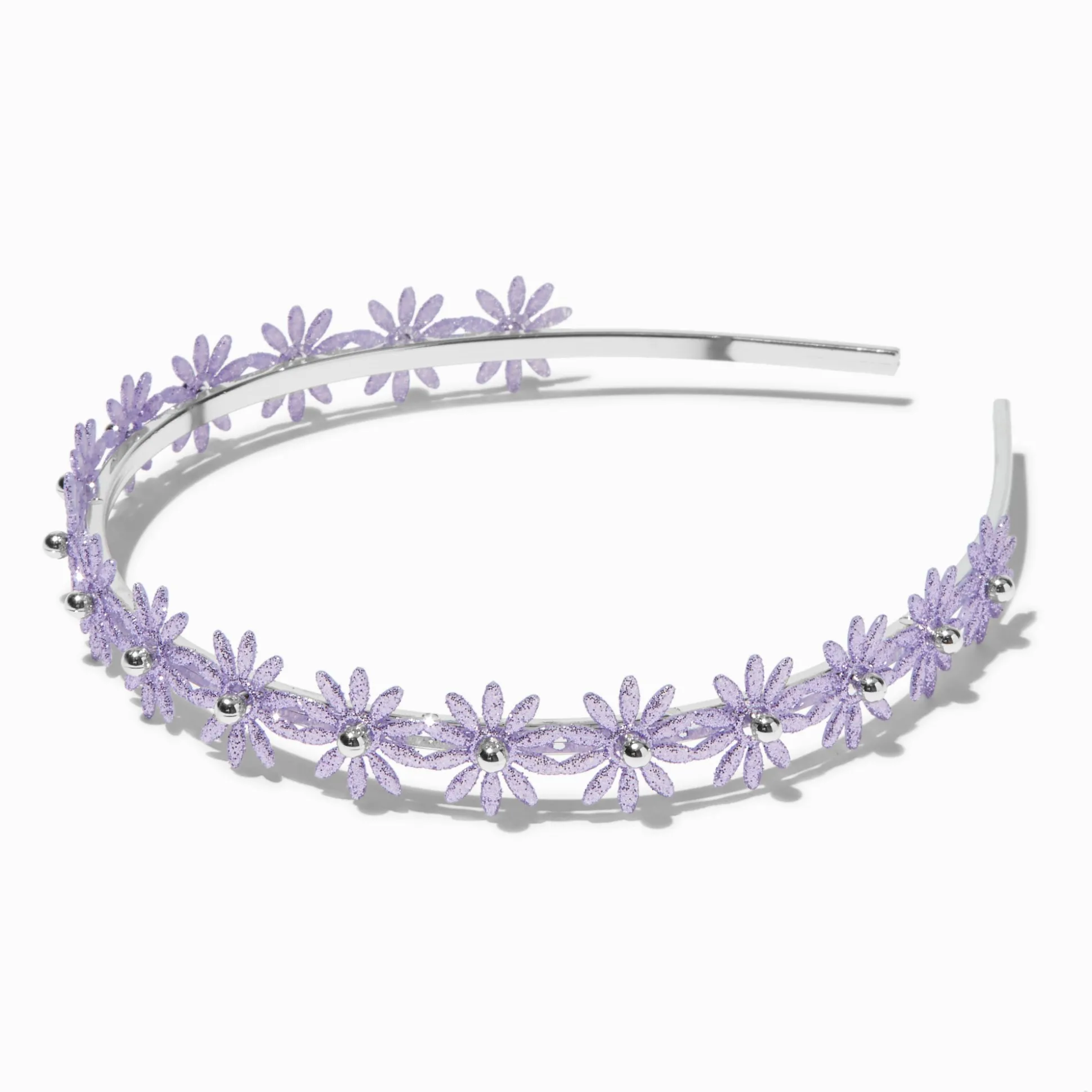 Tire tes cheveux et ta frange en arrière avec ce serre-tête sur le thème du printemps. Ce serre-tête arbore des fleurs violettes, chacune ayant son propre strass et ses paillettes.