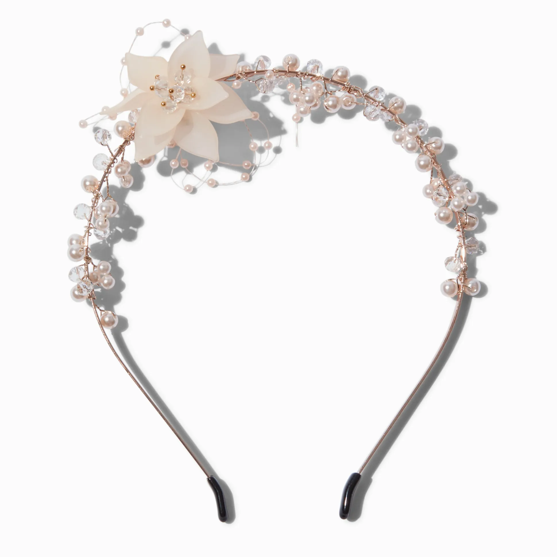 Des fleurs blanches décorent un serre-tête en métal couleur doré rose, et le serre-tête destiné aux grandes occasions est agrémenté de charmantes perles d’imitation.
