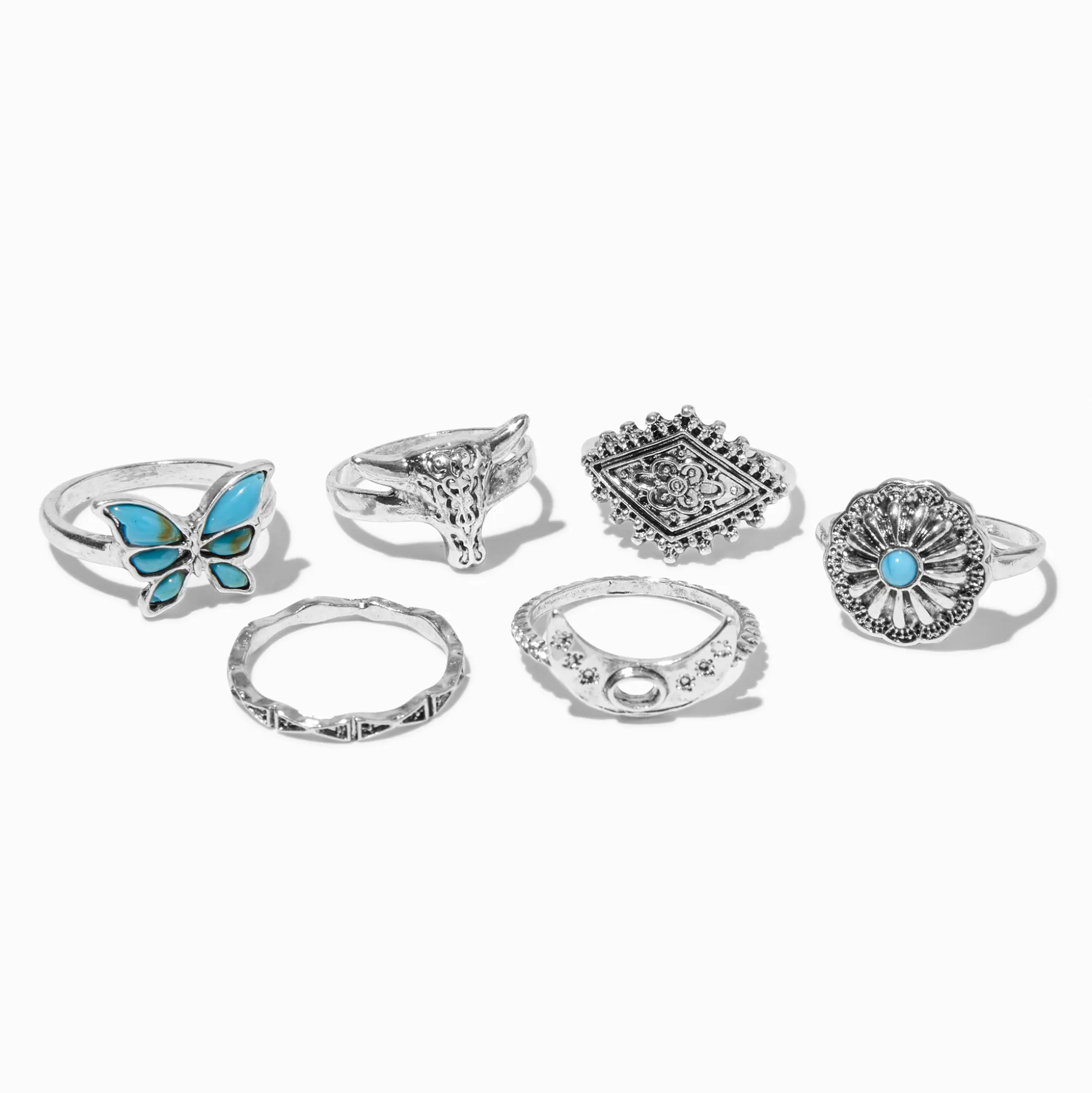 Create a look inspired by cowgirl style with these cowgirl rings. The six-pack set includes a faux turquoise butterfly, a bull, filigree medallions, and more. Wear them separately or stacked together for a variety of fashion looks.